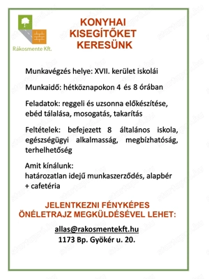 Munkavégzés helye: XVII. kerület iskolái Munkaidő: hétköznapokon 4 vagy 8 órában Feladatok: reggeli és uzsonna előkészítése, ebéd tálalása, mosogatás, takarítás Feltételek: befejezett 8 általános iskola, egészségügyi alkalmasság, megbízhatóság, terhelhetőség Amit kínálunk: határozott idejű munkaszerződés, ...