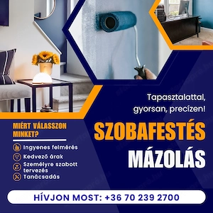 . 40 éves szakmai tapasztalattal vállalok Szobafestés,kerítések, nyílászárok, csövek, radiátorok, vasszerkezetek mázolását,tapétázás, fűrészporos, üvegszálas, kasírozott, habosított és hagyományos tapétát Díszítést,tükör mennyezet és oldalfal készítését polisztirol elemekkel . Korrekt áron garanciával. ...